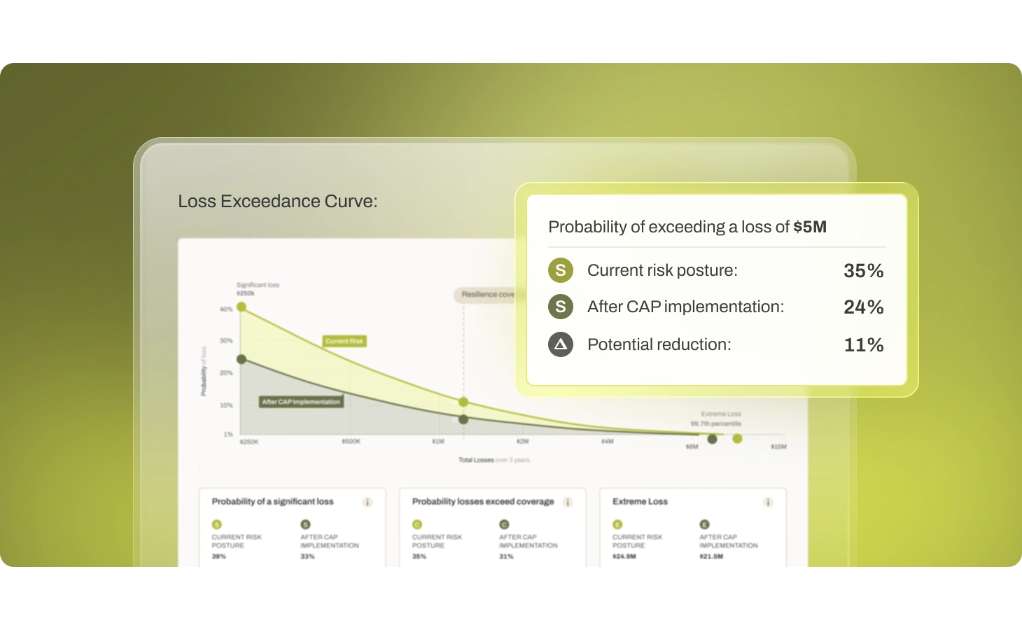 Skip the color-coded charts and arbitrary letter grades—Resilience Edge shows your risk in actual dollars based on your security controls and current threat activity.